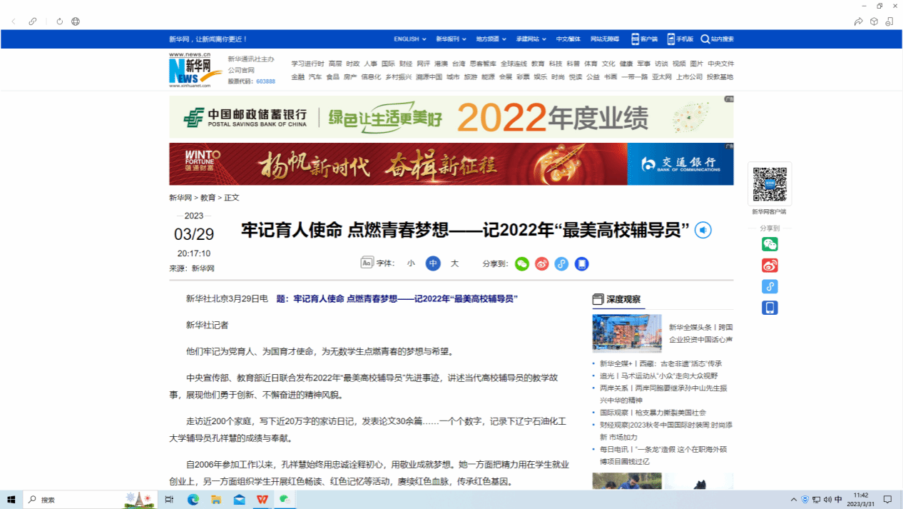 编者按:自2006年参加工作以来,孔祥慧始终用忠诚诠释初心,用敬业成就梦想。她一方面把精力用在学生就业创业上,另一方面组织学生开展红色畅读、红色记忆等活动,赓续红色血脉,传承红色基因。近日,光明日报、新华网、学习强国、凤凰网、精神文明报等媒体平台,对全国最美辅导员、我校团委副书记孔祥慧老师的事迹进行了宣传报道。现将相关报道转载如下: