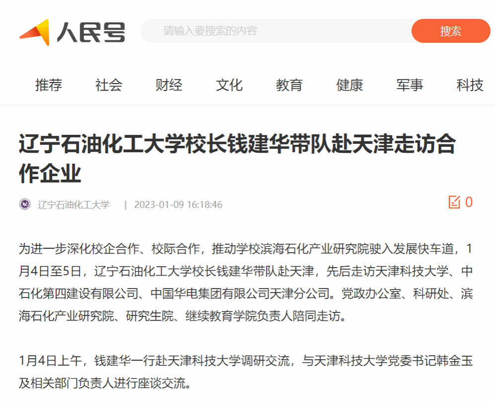 编者按:近日,辽宁日报·北国号、人民日报客户端·人民号等媒体平台对我校校长钱建华带队赴天津,先后走访天津科技大学、中石化第四建设有限公司、中国华电集团有限公司天津分公司进行了宣传报道。现将相关报道转载如下: