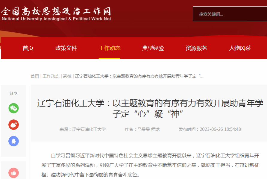 编者按:近日,全国高校思想政治工作网、辽宁日报·北国号对我校组织青年开展了丰富多彩的系列活动,引领广大学子在主题教育中不断筑牢信仰之基,砥砺实干担当,在奋进新征程、建功新时代中留下最绚丽的青春奋斗底色进行了宣传报道。现将相关报道转载如下: