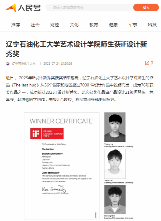 编者按:近日,辽宁日报·北国号、人民日报客户端·人民号等媒体平台对我校艺术设计学院师生的作品《The last hug》从56个国家和地区超过7000 件设计作品中脱颖而出,成为76项获奖作品之一,成功斩获2023iF设计新秀奖进行了宣传报道。现将相关报道转载如下: