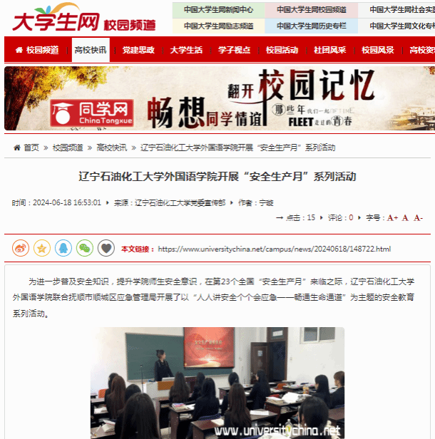 编者按:近日,中国大学生网、人民日报客户端·人民号、辽宁日报·辽望号对我校外国语学院在第23个全国“安全生产月”来临之际,联合抚顺市顺城区应急管理局开展了以“人人讲安全个个会应急——畅通生命通道”为主题的安全教育系列活动进行了宣传报道。现将相关报道转载如下: