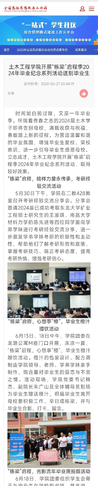 全国高校思想政治工作网:土木工程学院开展“栋梁”启程季2024年毕业纪念系列活动送别毕业生