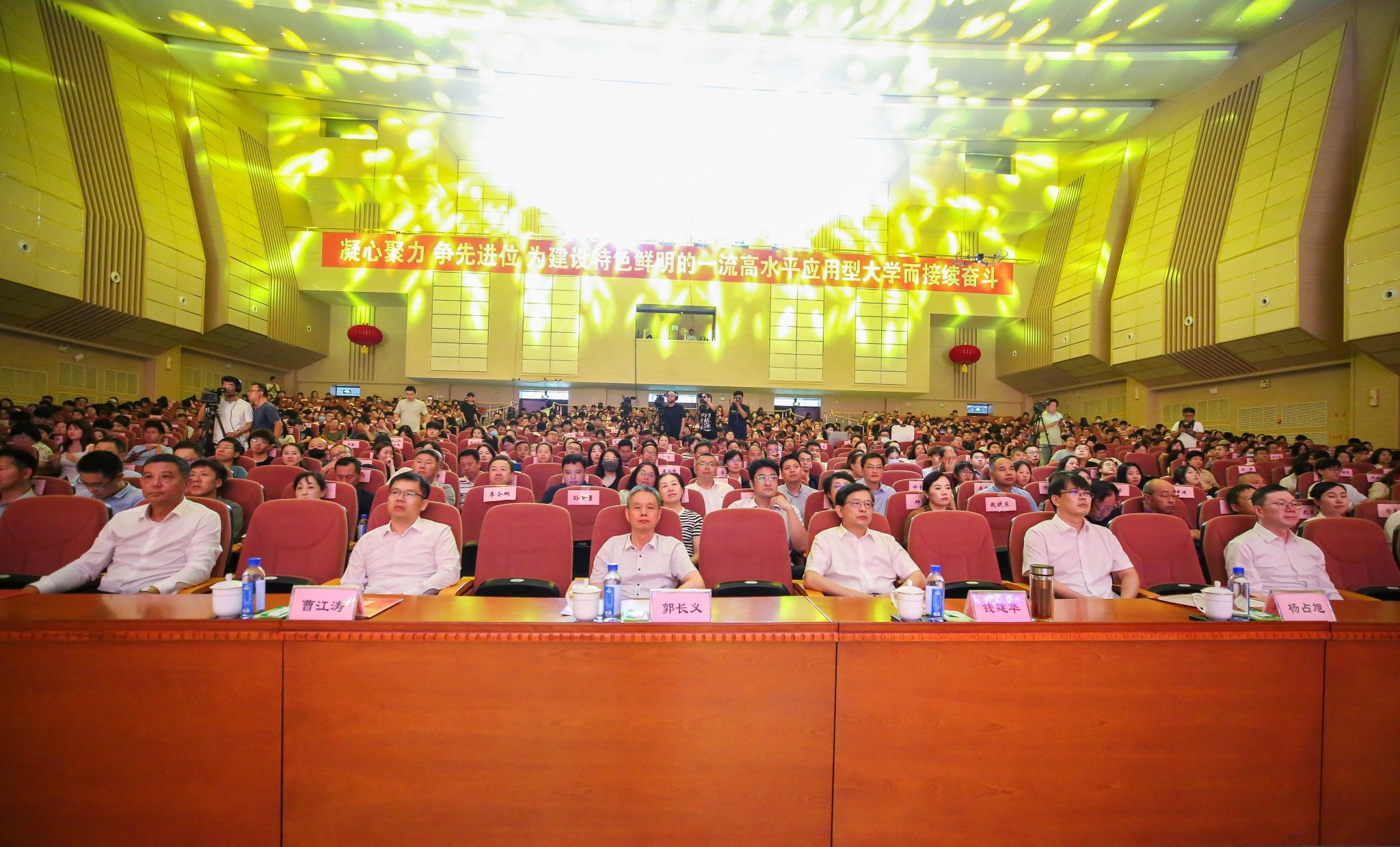 为落实好教育部《关于做好庆祝第40个教师节有关工作的通知》,大力弘扬教育家精神,全面展现学校教师立德树人、自信自强的精神风貌,9月6日下午,“大力弘扬教育家精神,加快建设教育强国”庆祝第40个教师节文艺晚会在大学生活动中心二楼礼堂隆重举行。校党委书记郭长义,校长钱建华,副校长孙铁、曹江涛、杨占旭,纪委书记房贵新,副校长刘海峰出席晚会,广大教师代表1000余人现场共同观看演出,晚会线上全程直播,累计点击量达万次。