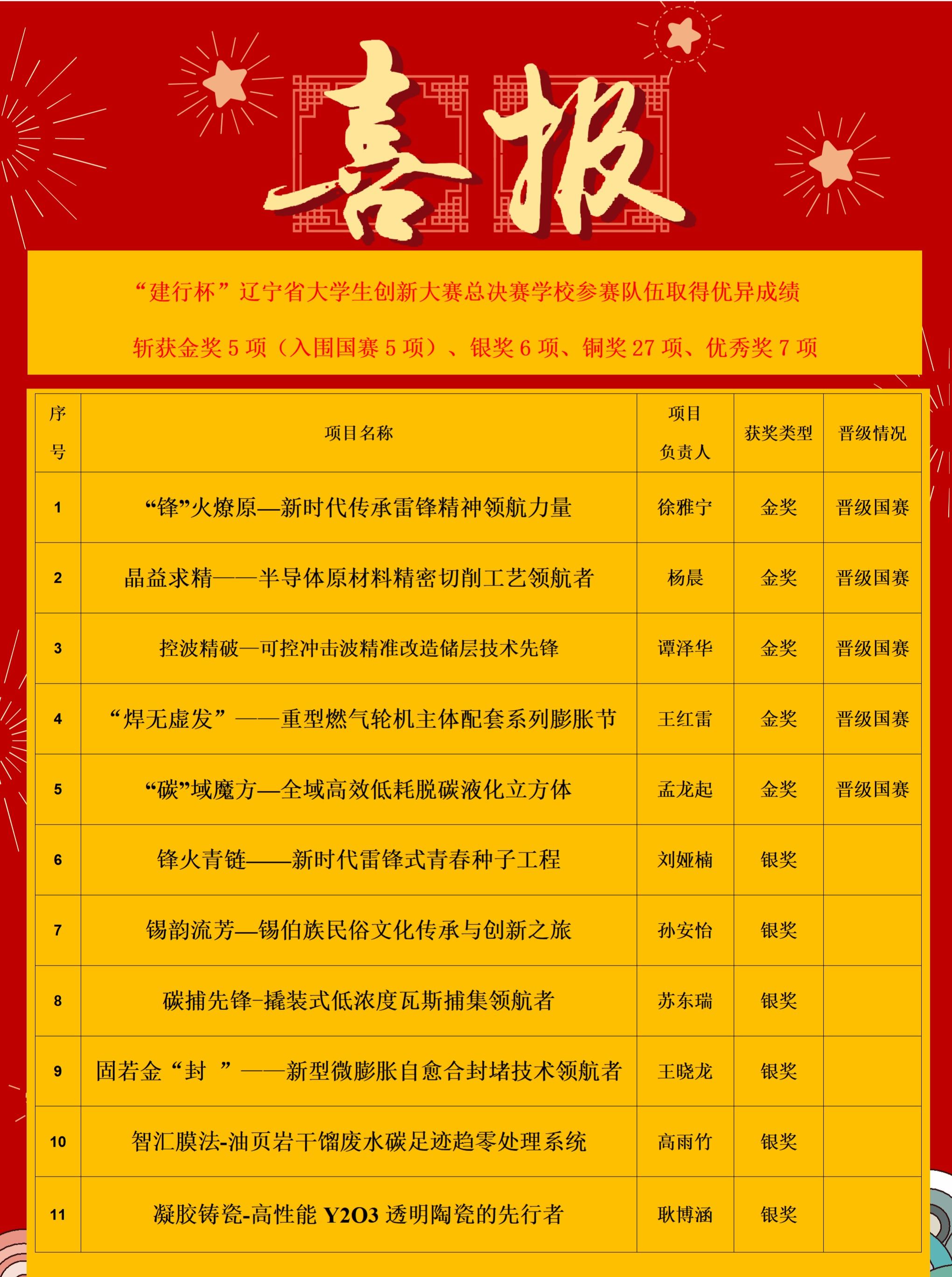 近日,“建行杯”辽宁省大学生创新大赛总决赛暨中国国际大学生创新大赛(2025)辽宁赛区决赛圆满落幕。我校在此次大赛中表现卓越,共斩获省金奖5个、银奖6个、铜奖27个、优秀奖7个,取得了优异成绩。“晶益求精——半导体原材料精密切削工艺领航者”等5个参赛项目获得金奖并全部入围国赛,涵盖高教主赛道、“青年红色筑梦之旅”赛道、产业赛道三个赛道,充分展现了我校参赛项目的高质量与覆盖的广泛性。晋级国赛数量取得了我校该项赛事的新突破。